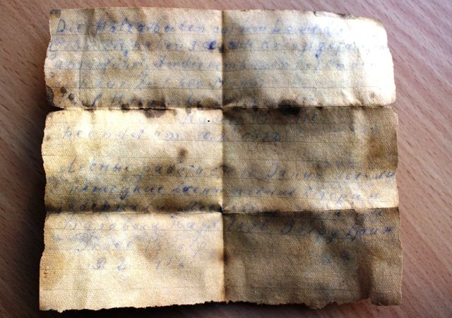 Листок с записями на немецком и русском языках был обнаружен во время ремонта в местном дворце культуры, который возводили военнопленные. Записка датирована 10 февраля 1952 года: «Лесные работы… Дания… делали три немецкие военнопленные… котори задержали Московские мерзавцы… Бироваки Паул, Яков Волф Ерин, Брае Рудолф».