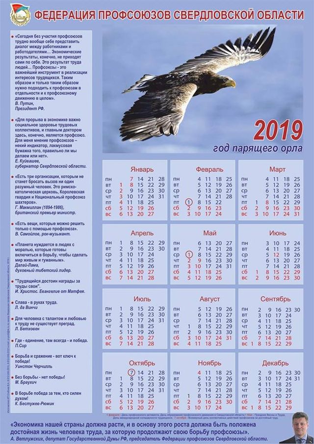 В Свердловской области выпущен календарь в честь «Года парящего орла». Идея позаимствовать название из славянского языческого календаря была воплощена Федерацией профсоюзов Свердловской области (ФПСО). В соцсетях обсуждают, как это соответствует канонам православия, которых принято придерживаться официальным структурам.
