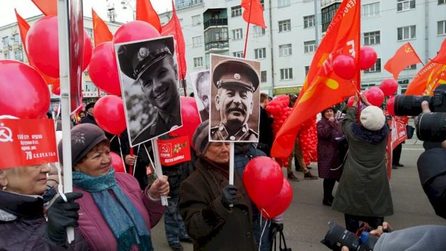 Отдельно от основной колонны шествие провели представители КПРФ. Коммунисты растянули плакаты с советскими лозунгами, вооружились красными знаменами и портретами известных советских деятелей. Среди прочих демонстранты несли портрет Иосифа Сталина.