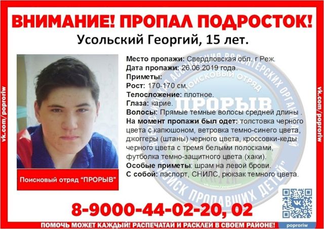 В Свердловской области уже несколько дней ищут 15-летнего Георгия Усольского, сообщается в группе поискового отряда «Прорыв» во «ВКонтакте».