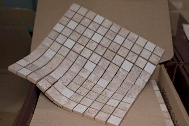 Раньше на этом участке женщины вручную нарезали специальную бумагу и клеили на мозаичные плитки. Потом оставляли на просушку до следующей смены. Один работник мог сделать примерно 20-25 таких плиток в день. Сегодня производительность увеличилась вдвое, не говоря уже о том, что работницы гораздо меньше устают.