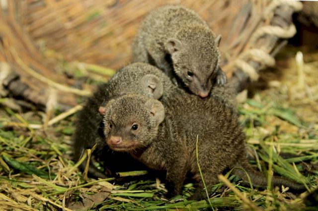 Верта и Моня впервые принесли потомство, но, несмотря на возраст, оба оказались очень заботливыми родителями, а Лавина – отличной нянькой-воспитателем. Новорожденные детеныши весят около 30-40 гр. и первые несколько недель проводят в укрытии. Пока взрослые мангусты кормятся, в убежище с детьми остается «нянька». В природе дети даже от разных самок держатся вместе и кормят детенышей молоком необязательно их матери. Такое коммунальное выращивание детенышей позволяет молодым, неопытным самкам успешно участвовать в размножении.