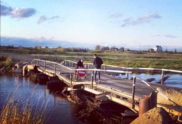 Как рассказал настоятель Варваринского храма иерей Алексей Власов, мост состоит из старых плит с дырами и из просто положенных поперек бревен, которые плохо закреплены. “Что там под ними с опорами моста - не знаю. Вряд ли он долго продержится под нагрузкой лесовозов и грузовиков с песком”, - говорит Власов.