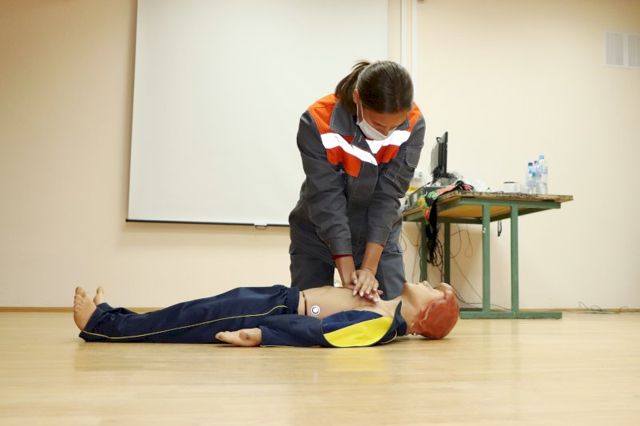 На этапе оказания первой доврачебной помощи конкурсанты приводили в сознание манекена Гошу и решали ситуационную задачу. Например, накладывали повязку условно пострадавшему с проникающим ранением грудной клетки.