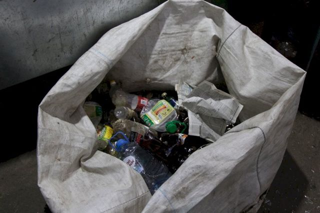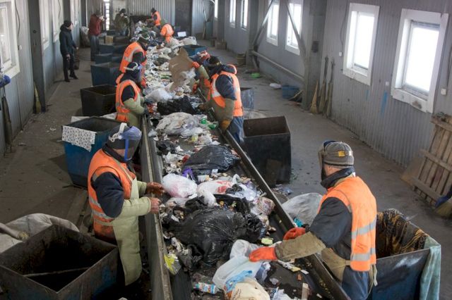 Мусор вывозится на полигон. Его здесь сортируют с 2013 года. По проекту комплекс был рассчитан на переработку 20 тыс. тонн ТБО в год. После модернизации сортировочной линии мощность увеличили, и за 10 месяцев этого года предприятие переработало 36 тыс. тонн. Мусор перегружают на конвейер, и рабочие вручную отбирают с линии полезные элементы: металл, пластик, ПЭТ, картон, стекло. За годы работы у сортировочного завода налажены связи с производителями, выкупающими вторсырье. Из мешков оно попадает под пресс, и в виде кубов отправляется на переработку.