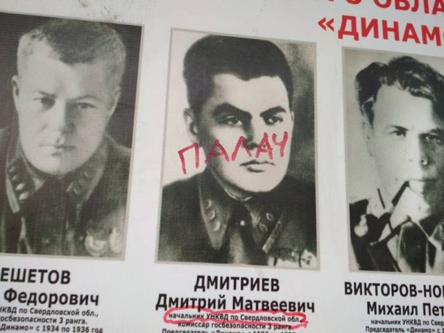 Фотовыставка в честь 95-летия спортивного сообщества «Динамо» в Екатеринбурге – в центре скандала. Портрет одного из председателей организации – Дмитрия Дмитриева – сегодня был перечеркнут красной надписью «Палач».