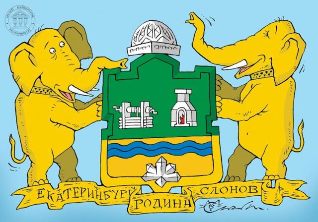 Роль щитодержателей на гербе Смагина исполняют слоны, а девиз гласит: “Екатеринбург – родина слонов”.