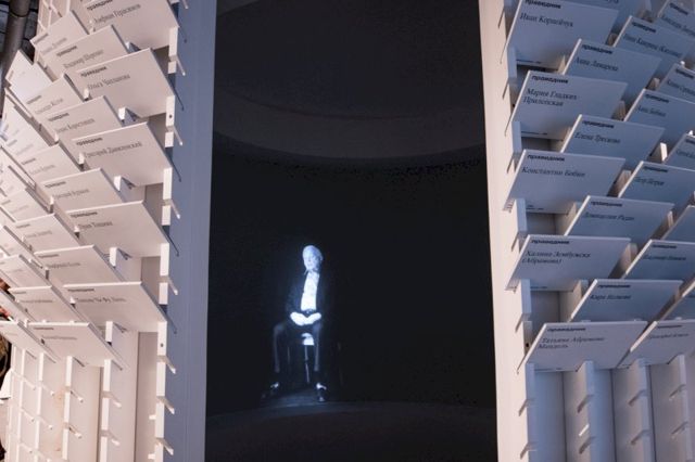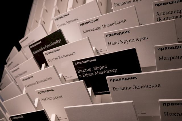 В центре экспозиции – стилизованное круглое убежище. С наружной стороны – таблички с именами героев выставки и спасенных ими людей. Внутри убежища – медиаэкран, на котором транслируются интервью с жертвами Холокоста. Представители еврейского сообщества называют спасителей Праведниками.