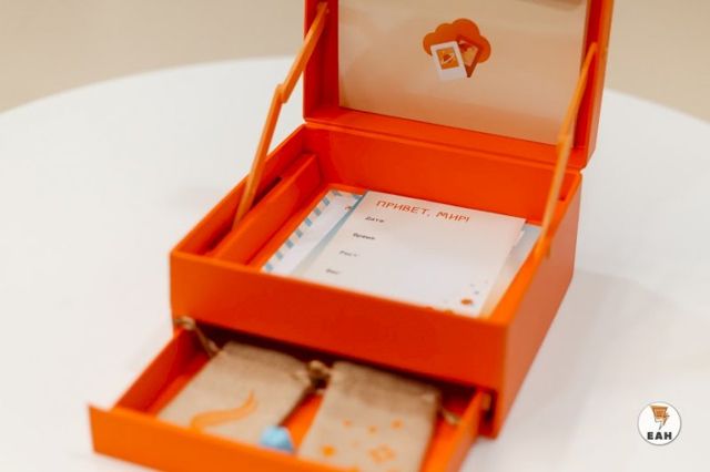 Второй необычный подарок от нас – это так называемая «капсула времени», представляющая собой небольшой оранжевый сундучок. У моей мамы бирка из роддома и мои волосы хранятся в рыжей коробочке из-под драгоценностей. Мы решили сделать что-то подобное и вручаем пациенткам «капсулу времени», которую можно заполнять – положить туда первые волосики, первый зубик малыша.