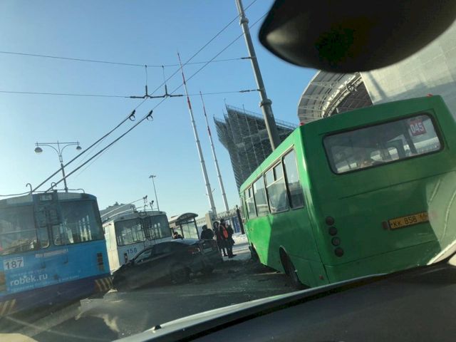 В Екатеринбурге напротив дома № 4 по ул. Репина столкнулись два автобуса, легковой автомобиль и троллейбус.