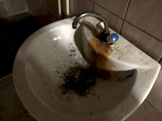 Наблюдатели заметили, что света нет и в туалете. Унитаз и раковина отключены от водоснабжения, раковина забита окурками. Для смыва, как видно на фото, использовалась пластиковая бутылка с водой. При этом в журнале посещений ОНК ровно те же претензии к полицейским датированы еще 2016 годом.