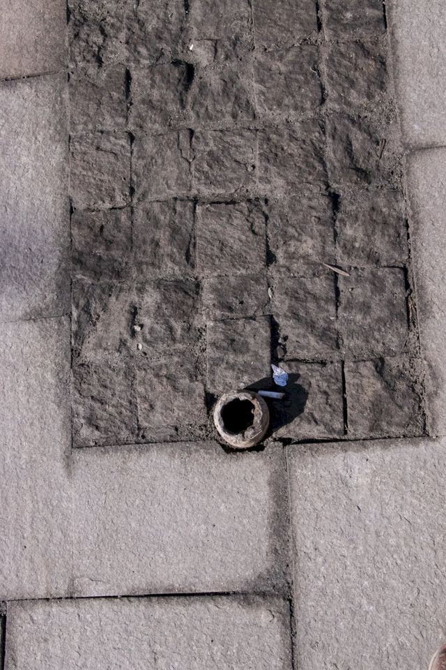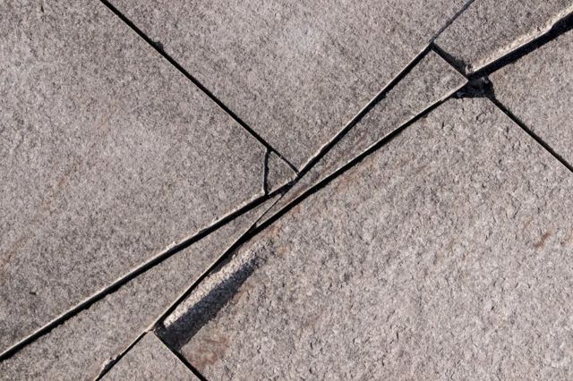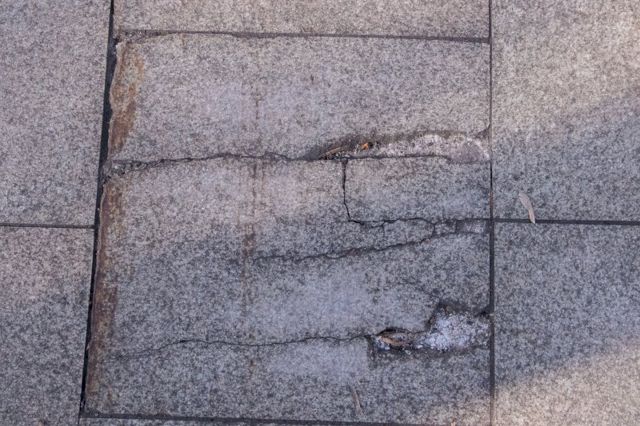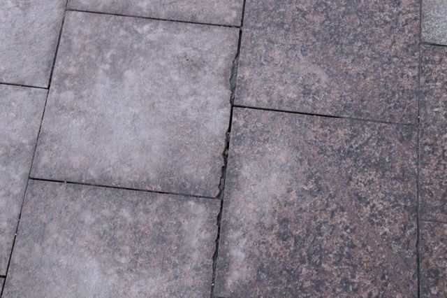 Новая плитка местами выглядит как старая. Трещины, сколы, зазубрины, запилы на граните встречаются по всему тротуару.