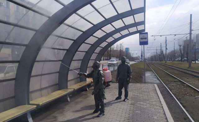 С 14 апреля масштабные работы проводятся по дезинфекции остановок общественного транспорта на улицах Екатеринбурга. Спасатели в средствах индивидуальной защиты распыляют дезинфицирующее средство с помощью специального оборудования. Средство, которым обрабатываются остановочные комплексы, абсолютно безопасно для людей.