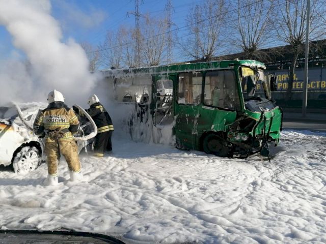 «Сообщение о ДТП на улице Шефской поступило в 07:34. Произошло столкновение маршрутного автобуса и легкового автомобиля, в результате этого транспортные средства загорелись», — сообщили спасатели.