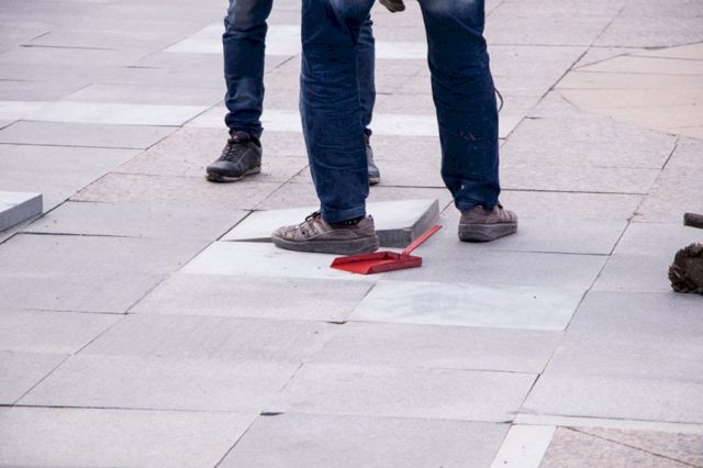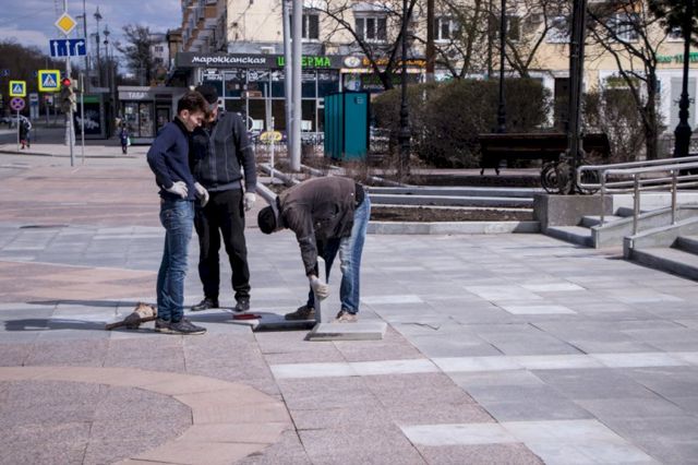Зимой по свежеуложенным тротуарам ездила снегоуборочная техника, и поверхность пошла волнами. Под плитку, объяснил строитель, попадала вода, лед, и отдельные бруски выдавило вверх. Рабочие намерены за несколько дней заменить сколотую плитку, выровнять ее по высоте, замести песком стыки.