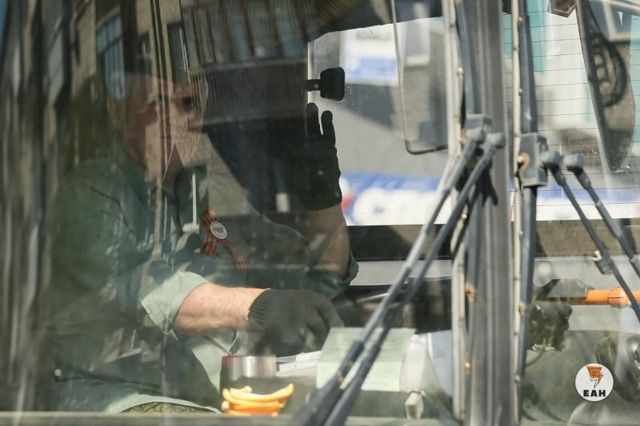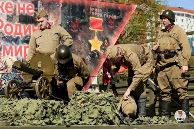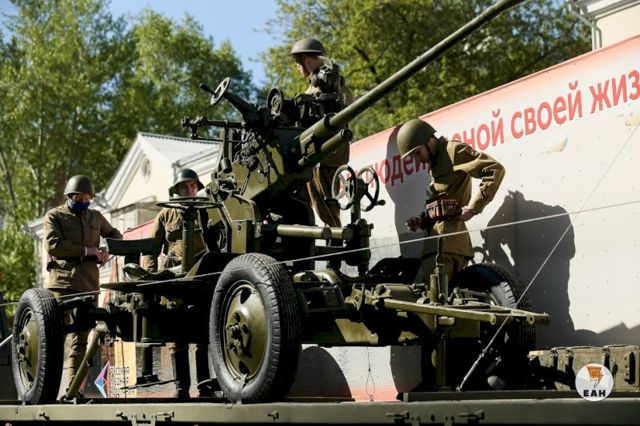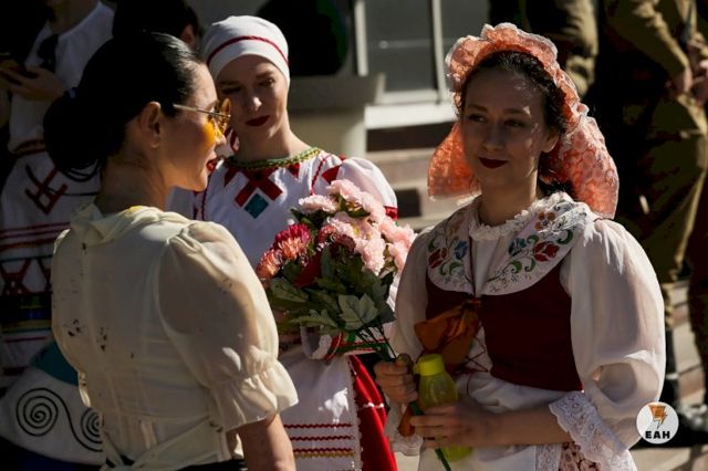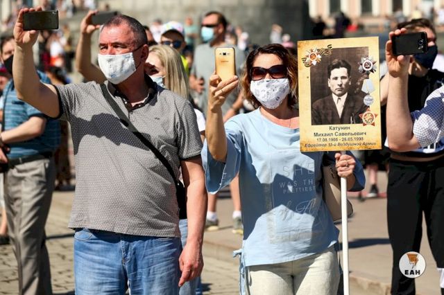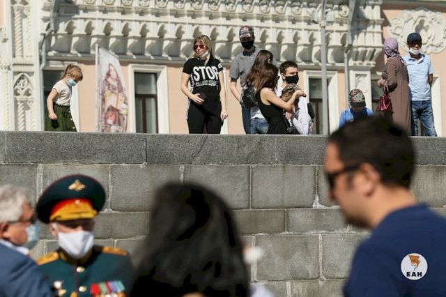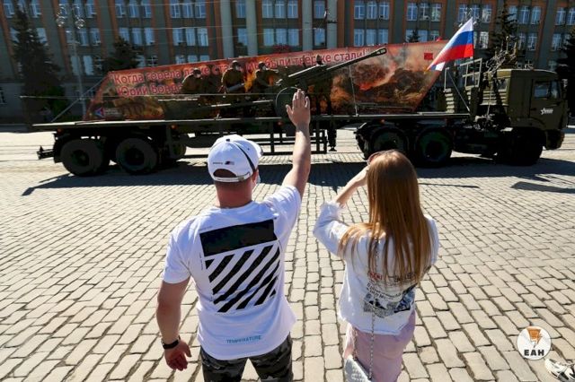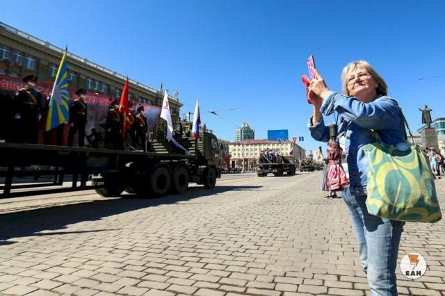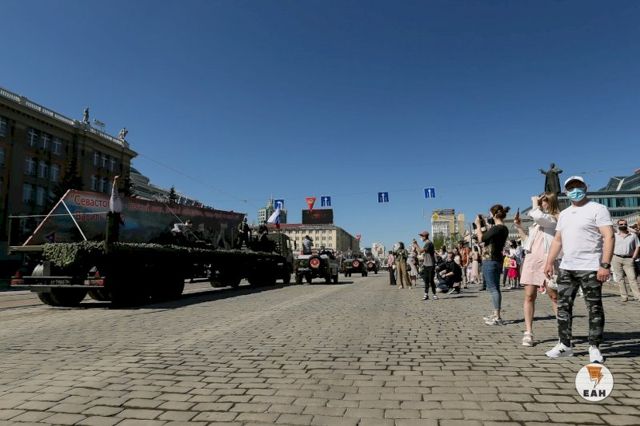 С самого утра в центре города было много гуляющих людей, которых не пугала опасность получить штраф. Горожане приветствовали авиапарад и проход по центру военной техники.