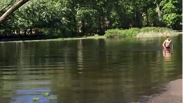 Видео купающегося в пруду дендрологического парка мужчины прислали в редакцию ЕАН очевидцы. Отметим, что обычно в этот водоем никто заходит даже в День десантника.
