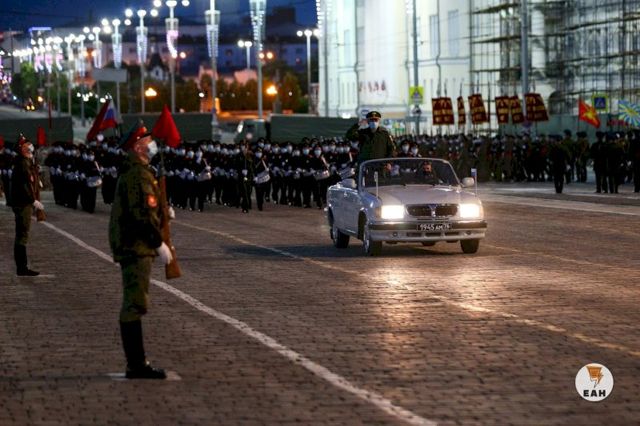 В Екатеринбурге проходит первая полноценная ночная репетиция парада Победы. По главной городской площади пройдут праздничные коробки военнослужащих и проедет как современная, так и раритетная военная техника Центрального военного округа.