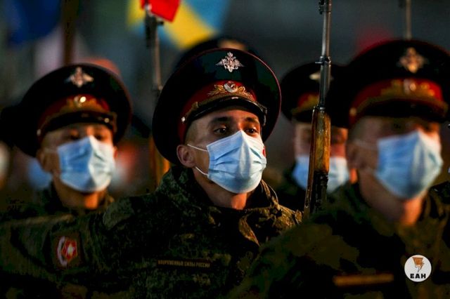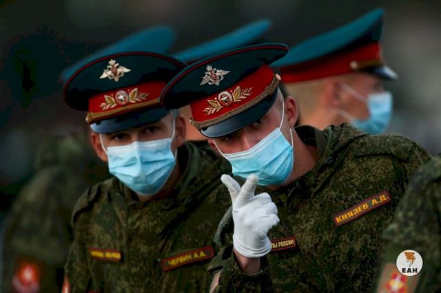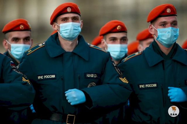 Перед началом тренировки мобильные расчеты войск радиационной химической и биологической защиты ЦВО провели специальную обработку Площади 1905 года, продезинфицировали места построения и линию прохождения парадных расчетов, всего более 7 000 кв. м.