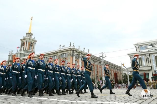 Торжественным маршем в парадной форме одежды под аккомпанемент сводного оркестра Екатеринбургского гарнизона прошли рота барабанщиков Екатеринбургского суворовского военного училища, знаменосцы со штандартами фронтов, подразделения в исторической форме времен Великой Отечественной войны, а также сводный женский взвод почетного караула, впервые принимающий участие в параде Победы. За ними в парадном строю - расчеты управления штаба и авиационного объединения ЦВО, коробки военнослужащих мотострелкового, железнодорожного соединений и единственный парадный расчет военной полиции за Уралом.