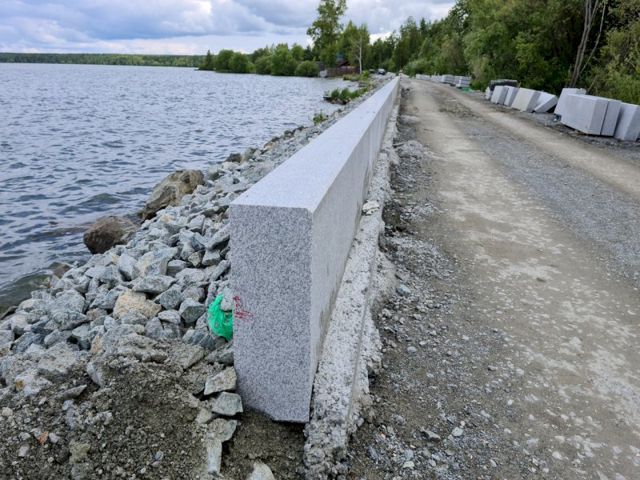 В лесопарке на берегу озера Шарташ в Екатеринбурге продолжается установка бордюра высотой 1 м и длиной 200 м вдоль береговой линии. Смонтировано уже около 20 м, и теперь можно визуально оценить, как гранитная конструкция впишется в окружающую среду.
