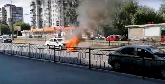 В Екатеринбурге на проезжей части улицы Уральской сегодня утром горел автомобиль Lada Granta, который предположительно принадлежал одному из агрегаторов такси.