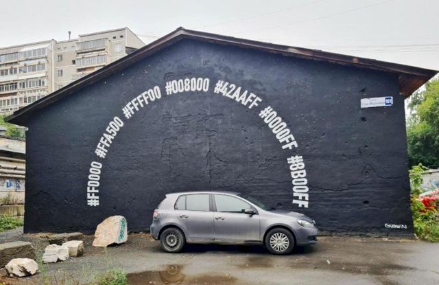 Одну из них на стене заброшенного здания по адресу улица Сони Морозовой, 161 разместил автор под именем Миша Гудвин. Работа представляет собой черный фон с хештегами, расположенными в виде дуги. Каждая надпись соответствует кодам цветов в программах фотовидеоредакторов.
