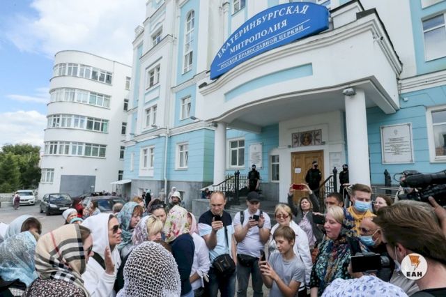 Сторонники бывшего схиимонаха Сергия пришли к зданию Екатеринбургской епархии. Они выступают против закрытия монастыря.