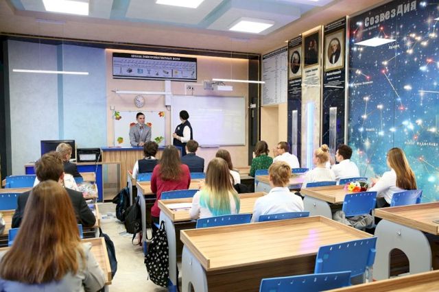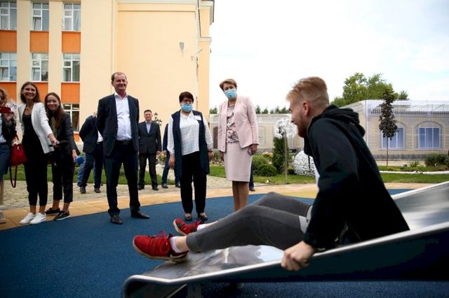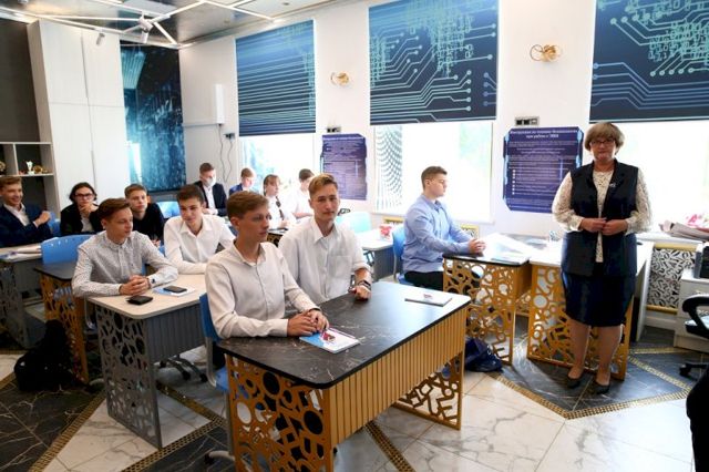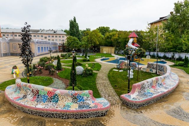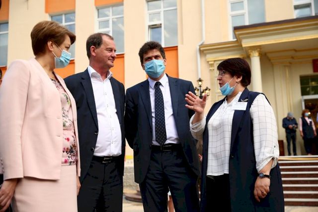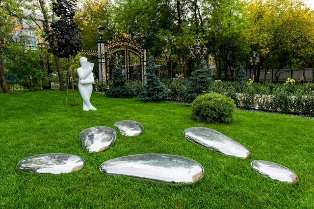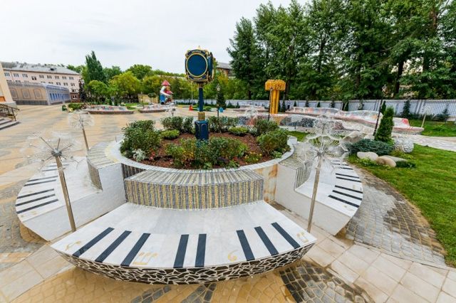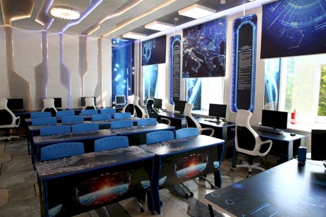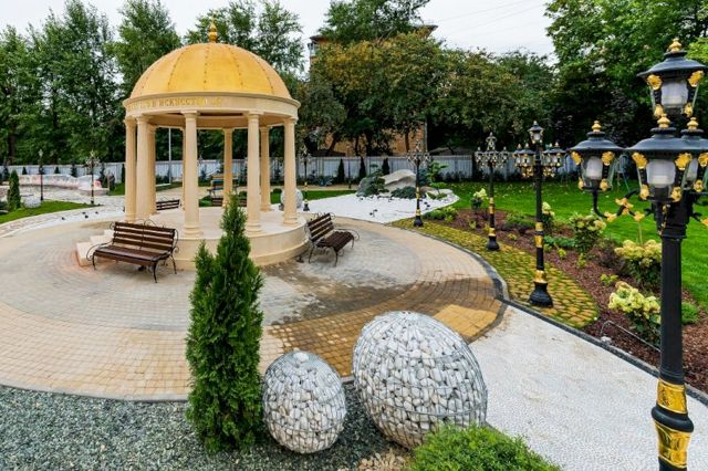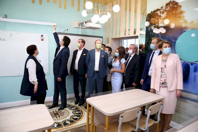 В школе отремонтировали кабинеты физики, химии, биологии и информатики, общие зоны и благоустроили территорию: установив газоны и клумбы, литые ворота, беседка, скамейки, фонари, скульптуры.
