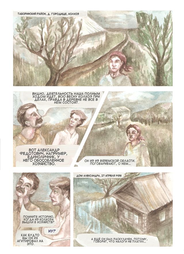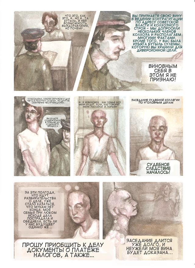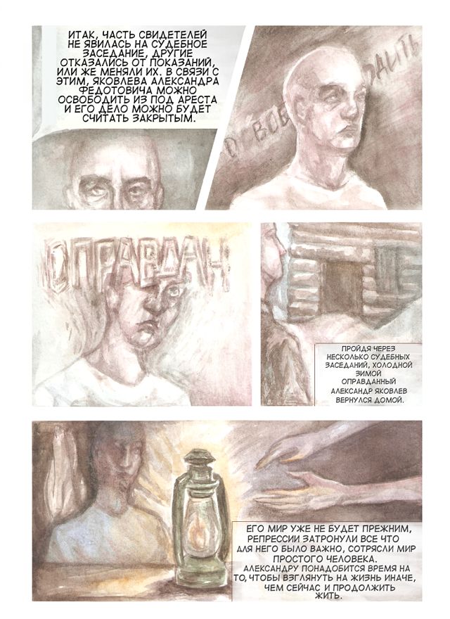 Другая рисованная история рассказывает о деле хлебороба и бывшего кулака Александра Яковлева. Крестьянин из деревни Городище был арестован после обыска, во время которого были обнаружены «аппарат самогона, аппарат для самогоноварения и одна бутылка раствора сулемы». Яковлева обвинили в «диверсии и антисоветской агитации и пропаганде». Позже мужчина был оправдан.