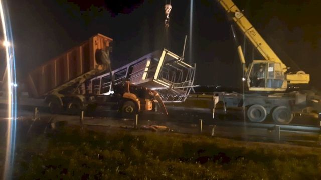 Как ранее сообщалось, возможной причиной обрушения моста стало столкновение открывшегося кузова самосвала с переходом. В результате конструкция упала на кабину грузовика. Водитель КамАЗа погиб.