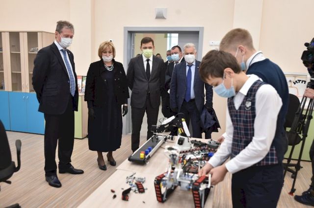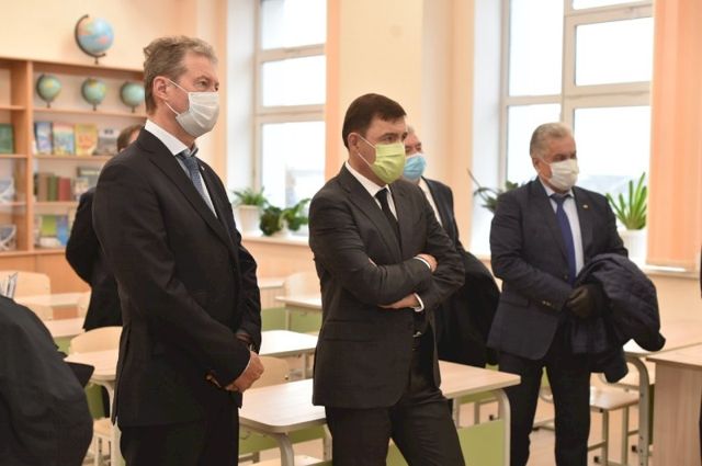 Губернатор Свердловской области Евгений Куйвашев вместе с генеральным директором УГМК Андреем Козицыным посетили недавно отремонтированную школу № 25 в Верхней Пышме.