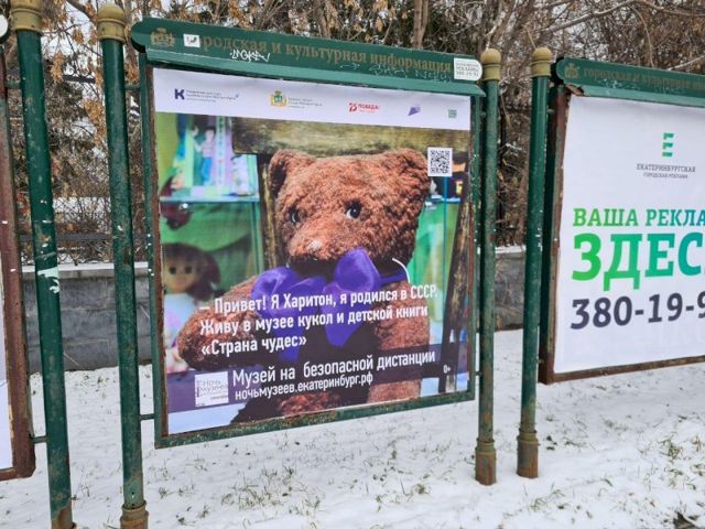 В частности, на одном из билбордов изображена мягкая игрушка — медвежонок, который говорит: «Привет, я Харитон, я родился в СССР. Живу в музее кукол и детской книги «Страна Чудес».