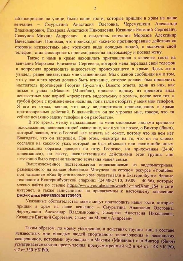 «В это время между нападавшими на меня молодыми людьми крепкого телосложения появился второй священник, как я узнал позже, о. Виктор (Явич), который заявил, что о. Георгий нас венчать не может, потому что на нем нет Благодати, что он запрещен. При этом, несмотря на то, что он на словах сослался на какой-то указ, который не был объявлен или каким-либо иным надлежащим образом доведен ни отцу Георгию, ни прихожанам (24.40 видеозаписи), по факту, насильственными действиями этой группы лиц незаконно было сорвано таинство венчания нашей семьи», — говорится в заявлении.