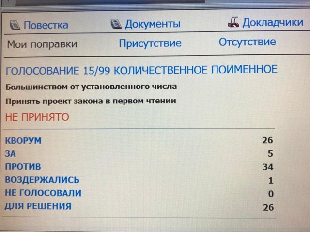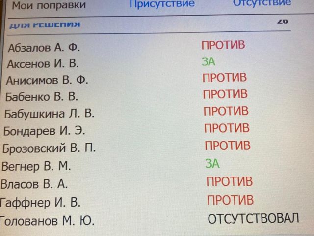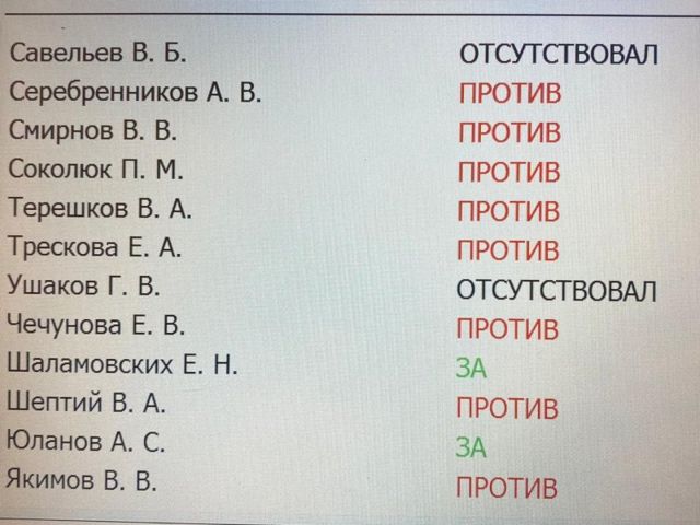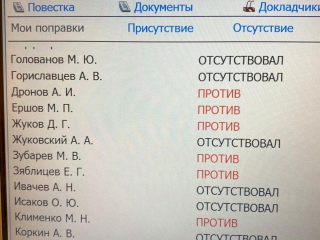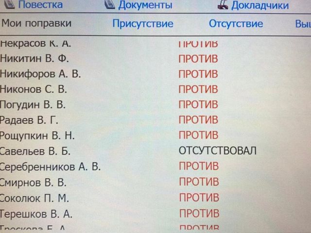 Отсутствовали в момент голосования лидер думских коммунистов Ивачев, единороссы Савельев, Кушнарев, Голованов, Гориславцев, Исаков и представитель ЛДПР Коркин.