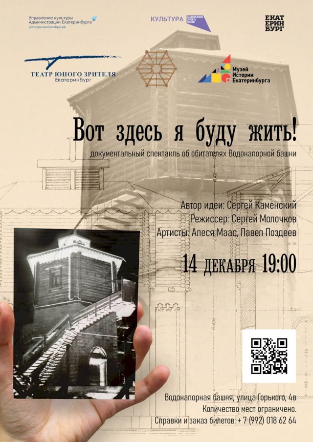 Документальный спектакль «Вот здесь я буду жить!» поставлен по воспоминаниям жителей башни. Зрители узнают истории трех семей — Денисовых, Перковских и Лопата, которые обитали там в разное время. Пьесу, созданную Екатеринбургским театром юного зрителя совместно с Музеем истории Екатеринбурга, представят сегодня, 14 декабря, в 19:00 в водонапорной башне на Плотинке.