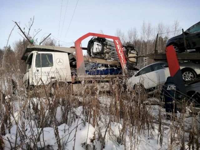 На 114-м километре трассы трассы Екатеринбург- Нижний Тагил автовоз Mercedes-Benz улетел с дороги в кювет.