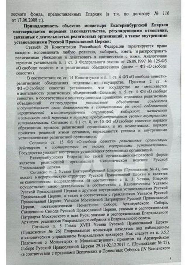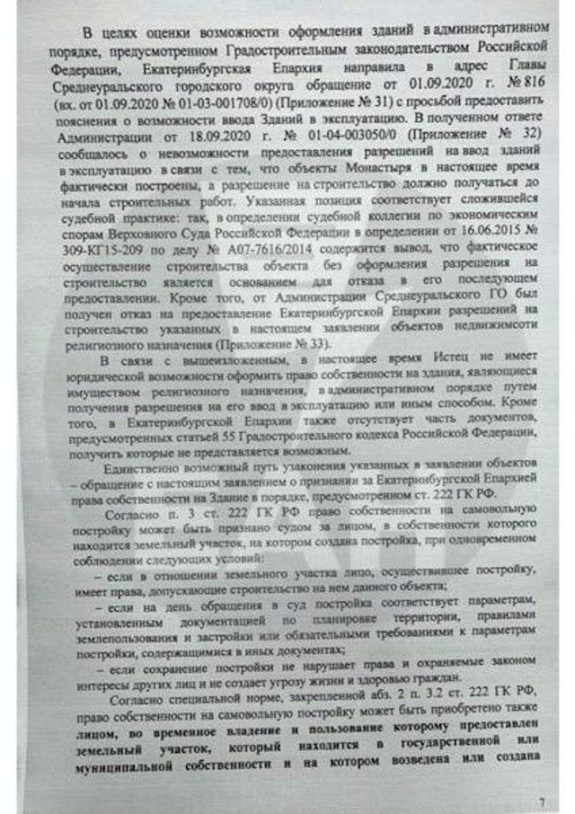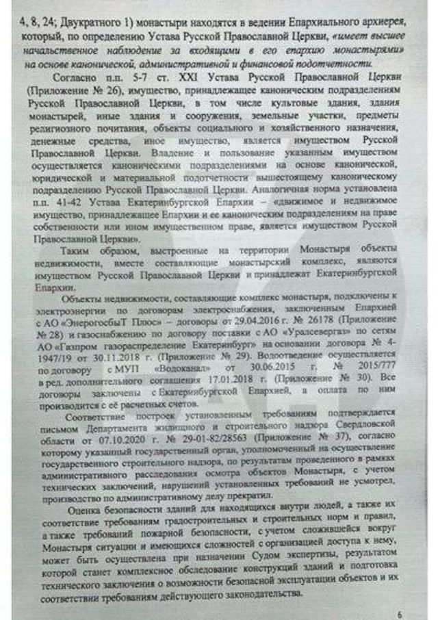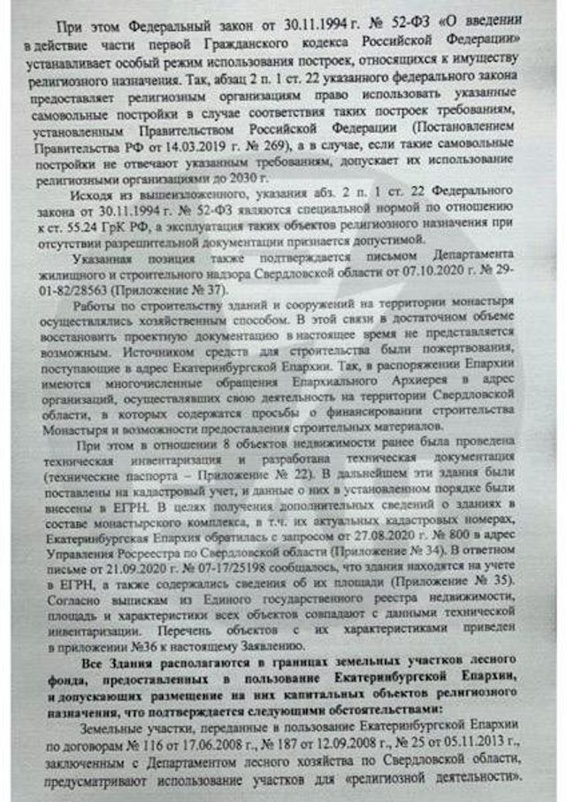 «Работы по строительству здания и сооружения на территории монастыря осуществлялись хозяйственным способом. В этой связи в достаточном объеме восстановить проектную документацию в настоящее время не представляется возможным. Источником средств для строительства были пожертвования, поступающие в адрес Екатеринбургской Епархии», - сказано в документе.