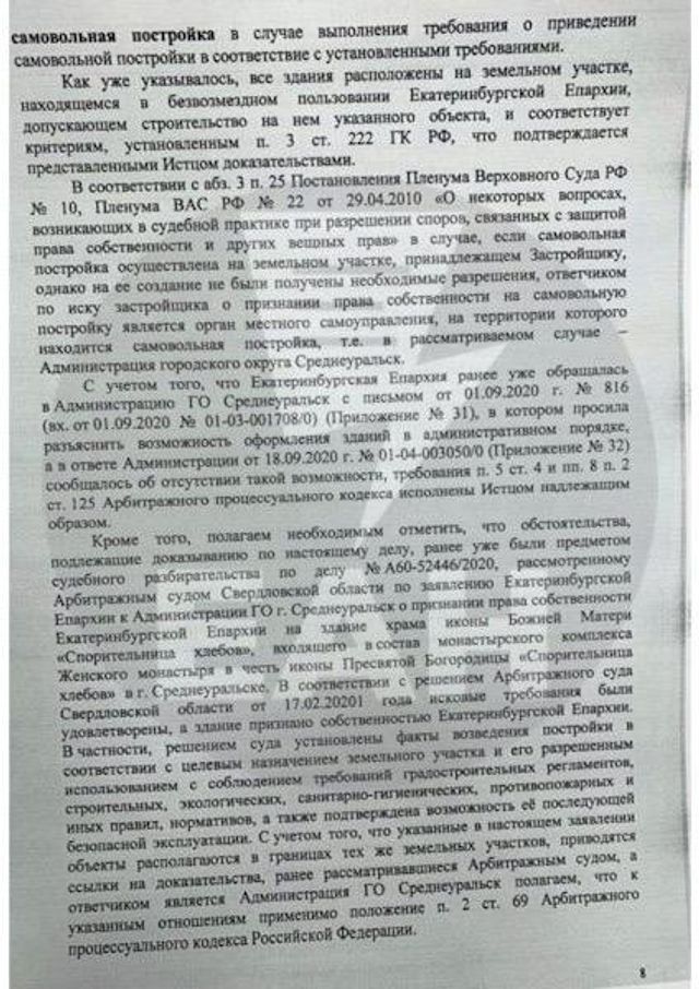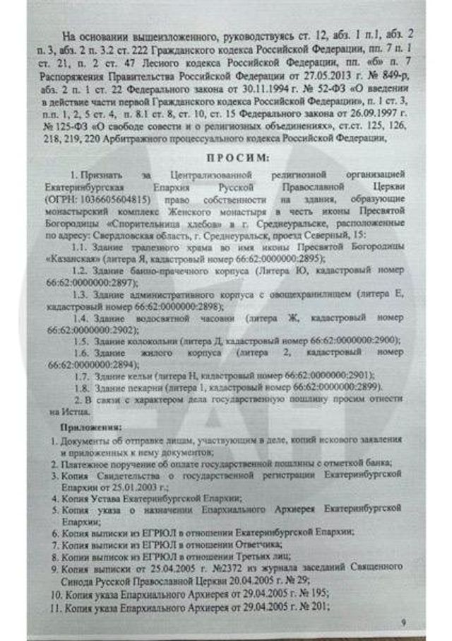 Последователи бывшего схиигумена Сергия опубликовали исковое заявление Екатеринбургской епархии к Администрации города Среднеуральска о признании права собственности на здания трапезного храма во имя иконы Пресвятой Богородицы «Казанская», здания банно-прачного корпуса и пекарни, водосвятной часовни, колокольни, келии и жилых корпусов.