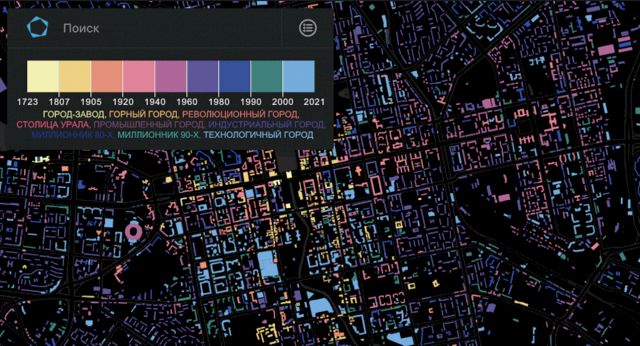В связи с этим появилась мысль выделить этапы застройки в соответствии со статусом города. Образованные категории четко объединяют городскую застройку на периферии в кластеры и указывают на ассорти из возрастов застройки в центре Екатеринбурга», - рассказали о карте создатели.