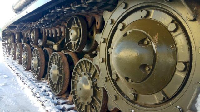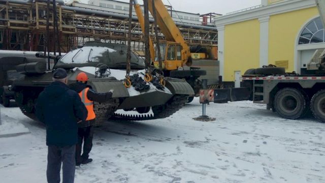 Его доставили на автомобильной платформе. Боевая машина может передвигаться своим ходом, но ее решили поберечь: возраст танка больше 70 лет, и эксплуатировать его без вреда для оригинальных узлов и механизмов можно только при постоянной плюсовой температуре, которая ожидается только в апреле. С трала танк спустили при помощи двух мощных кранов общей грузоподъемностью в 130 тонн.