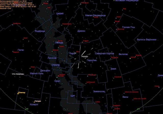 Метеорный поток Лириды получил такое название потому, что при наблюдении складывается впечатление, будто метеоры вылетают из созвездия Лиры. Звездопад идет в период с 16 по 25 апреля. Однако его интенсивность в остальные дни, кроме 22 апреля, будет гораздо ниже.