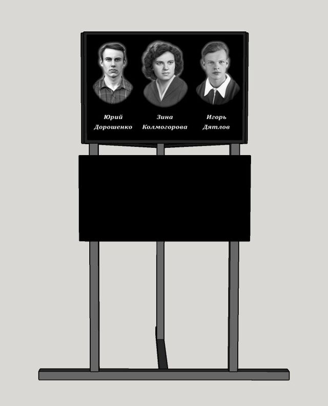 Он будет представлять из себя небольшую трехстороннюю «стеллу», на каждой из трех сторон будет находиться по три портрета участников группы Дятлова. Кроме стеллы, там же, в Вижае, Киреев планирует установить небольшую скульптурную композицию вроде беседке, внутри которой дятловцы будут как бы смотреть друг на друга.
