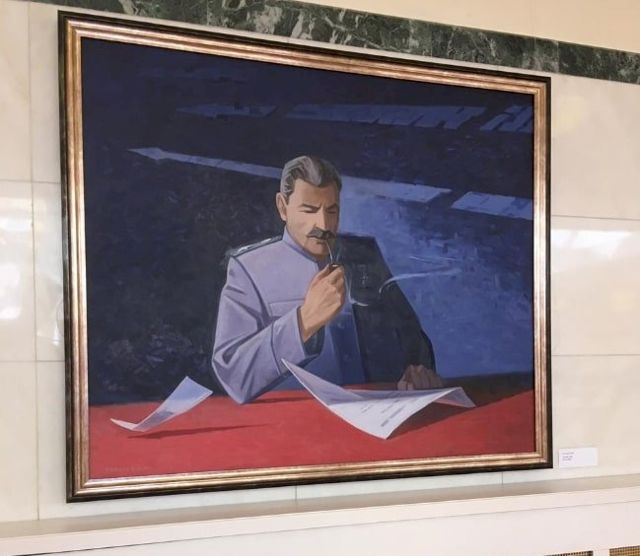 Генералиссимус изображен в классическом виде: во время работы с документами, во френче с погонами, с трубкой. Как стало известно ЕАН, автор картины – уральский живописец Владимир Тютюев.