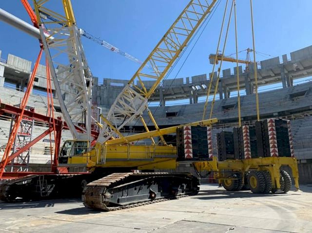 Он добавил, что ферма была собрана на Нижнетагильском заводе металлических конструкций. При изготовлении использован 41 элемент, скрепленный между собой 8 750 высокопрочными болтами. Поднимал конструкцию гусеничный монтажный кран TEREX-DEMAG CC2800 с длиной стрелы 72 м.