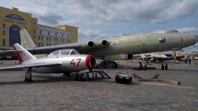 «Рядом с гигантским «Бизоном» разместили истребитель МиГ-15УТИ. Именно на таком самолете ушли в свой последний полет летчик-космонавт Юрий Гагарин и его инструктор Владимир Серегин. МИГ-15УТИ - это учебно-тренировочная версия МиГ-15. Советский самолет отличился в начале 50-х в Корее, одержав верх в противоборстве с американскими истребителями. На фюзеляже нового экспоната стоит автограф военного летчика Евгения Пепеляева. В небе над Кореей он сбил два десятка самолетов противника», - рассказали ЕАН в военном музей.
