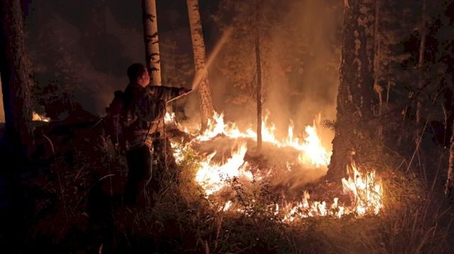 После подготовки минерализованной полосы и ослабления ветра спасатели подожгли лесной настил навстречу лесному пожару. Чтобы избежать повторного возгорания, спасатели проливают выжженную траву и деревья с помощью ранцевых огнетушителей.