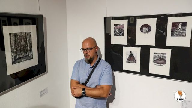 Еще одним ярким украшением пространства галереи стала выставка Гюнтера Дольхопфа «Графические метаморфозы реальности». Работы немецкого художника представлены в пределах двух основных стилистик: абстрактная графика (конгрев с прочеканенной тонкой цинковой пластины с последующей доработкой темперными красками) и сюрреалистические работы в литографии и digital print.