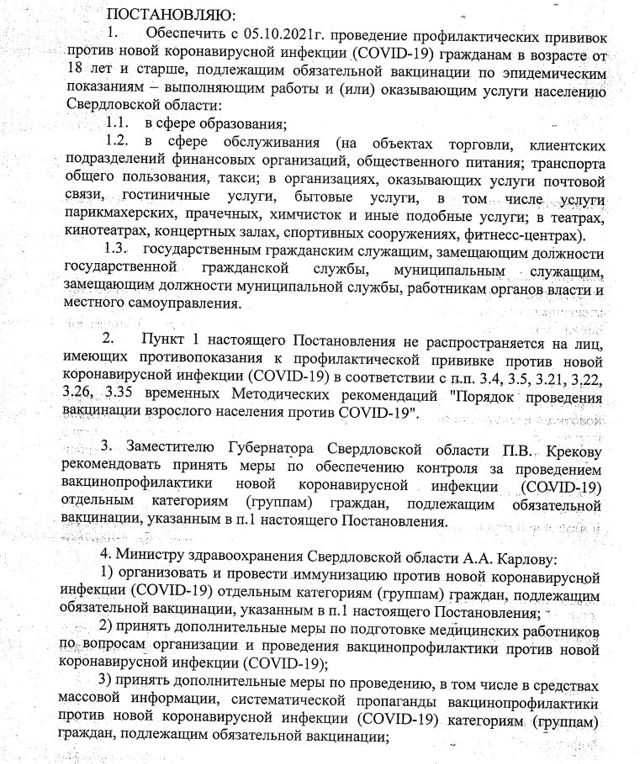 Главный санитарный врач Свердловской области Дмитрий Козловский подписал постановление о введении обязательной вакцинации от коронавирусной инфекции для отдельных категорий работников. Документ опубликован на сайте регионального управления Роспотребнадзора.