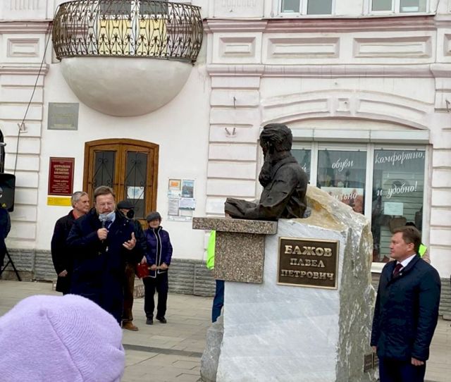 Вчера в Камышлове состоялось открытие композиции "Бажов Павел Петрович" скульптора Юрия Крылова. В данный момент это самый большой в России памятник писателю. Он выполнен из бронзы, мрамора и гранита. Композиция весит более пяти тонн, ее высота - более 3 м.